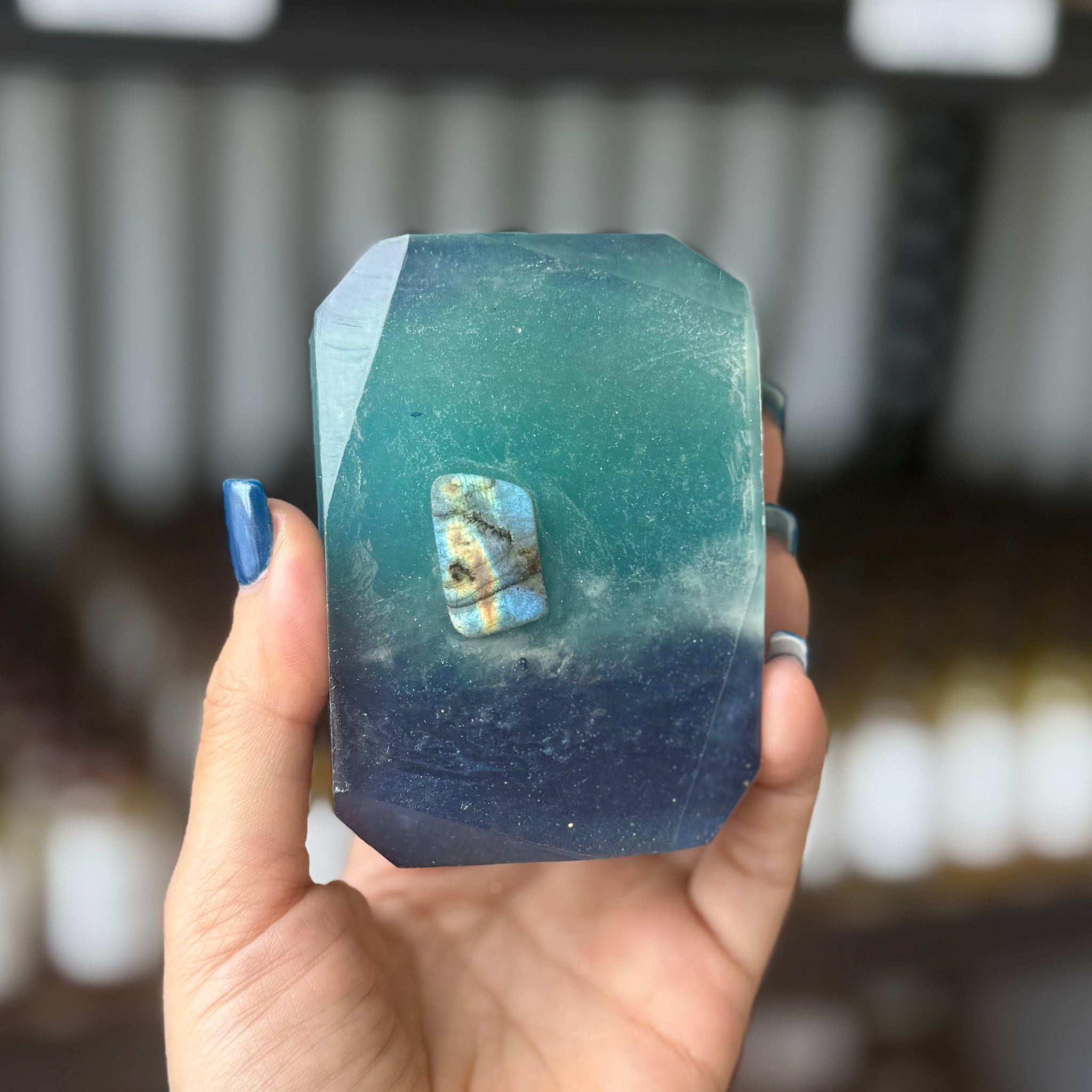 Ingredients: sunflower oil, sweet almond oil, mct oil, vitamin e, white mica, blue mica, Petitgrain, Ozone, Sea Salt, Plum, Eucalyptus, Sandalwood, Dark Musk, rose petals, iolite