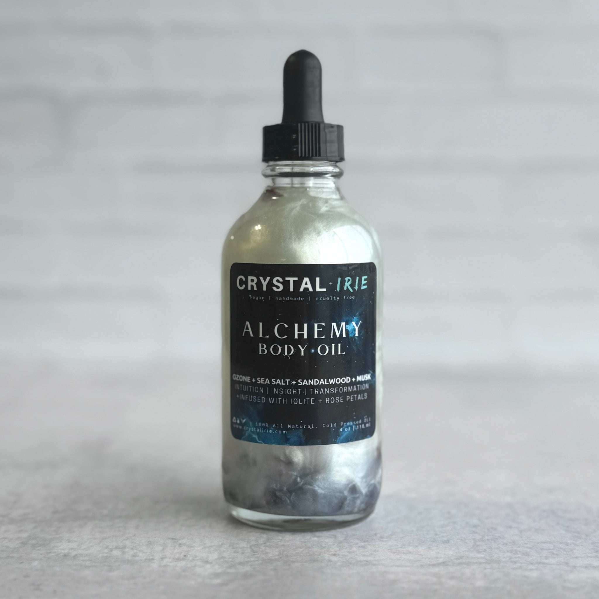 Alchemy Body Oil is infused with Roses + Iolite , the stone of "Inner voyage", to awaken intuition, deepen insight, and inspire transformation with clarity and purpose. Acting as a spiritual compass, Iolite helps transmute uncertainty into wisdom, sharpen inner vision, and reveal hidden paths. It harmonizes emotions, restores balance, and empowers you to embrace change like an alchemist turning lead into gold. Paired with delicate rose petals, this shimmer oil embodies balance, creativity, and the courage to evolve. Scented in a seductive blend of airy Petitgrain, Ozone, Sea Salt, Plum, Eucalyptus, Sandalwood and Dark Musk for an evocative fragrance that lingers on the skin.