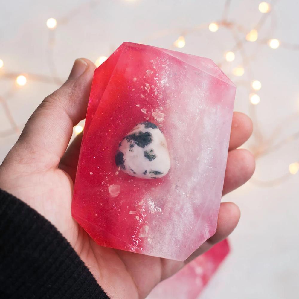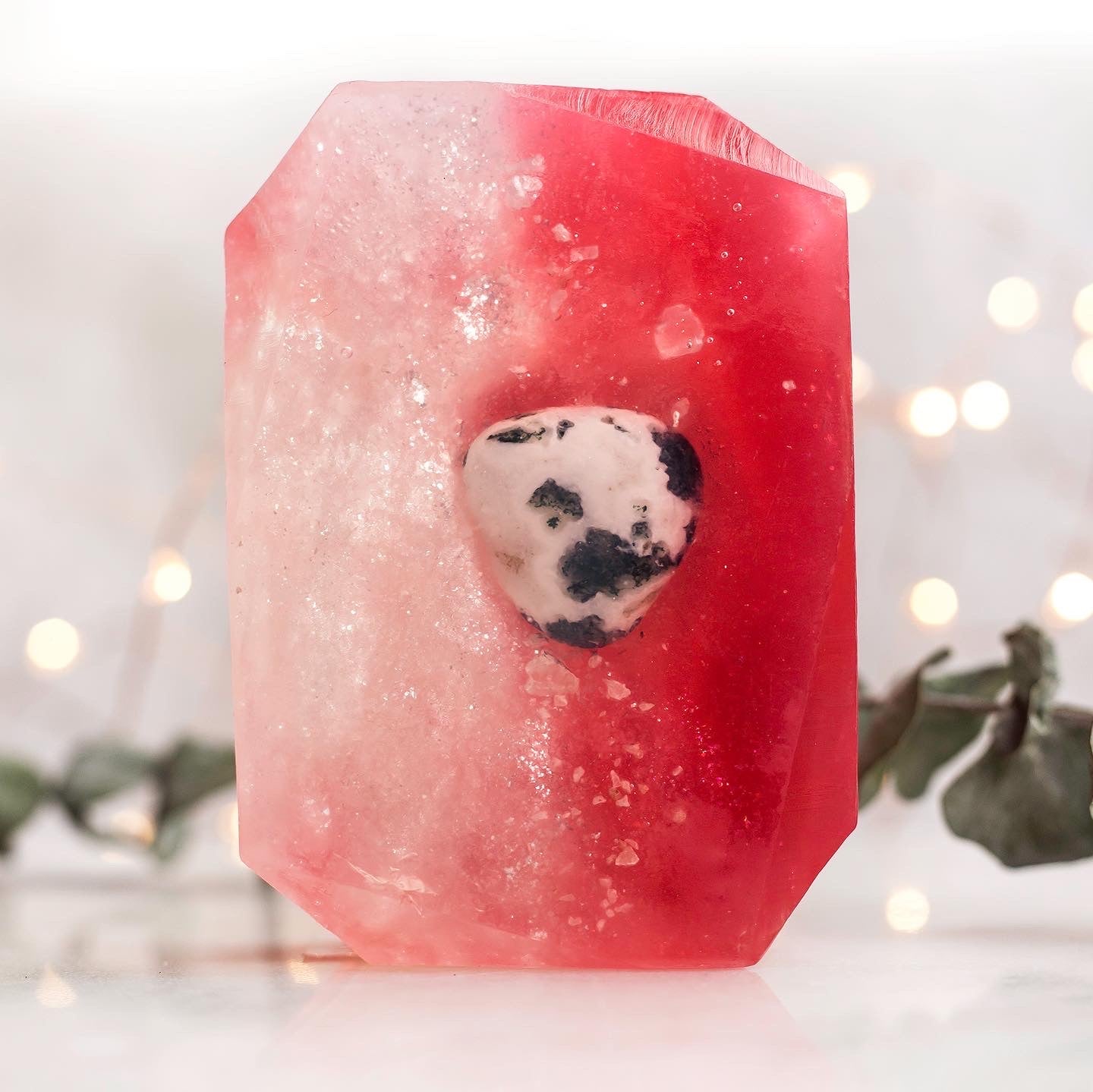 This Holiday inspired bar is embedded with aTree Agate crystal. Considered to be a Talisman, Tree Agate is a stone of inner peace. Tree Agate calms nerves, and can be combined with Clear Quartz to deepen meditation and prayer. Tree Agate brings our focus to the oneness of us all, dissolving egoism and arrogance. Brings abundance into your life. It clears blockages within your energy to open up the flow of money and prosperity. Deepens your connection with the earth.