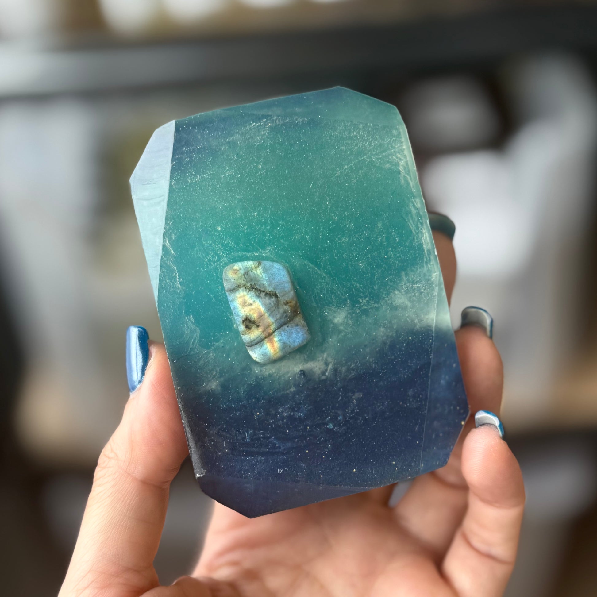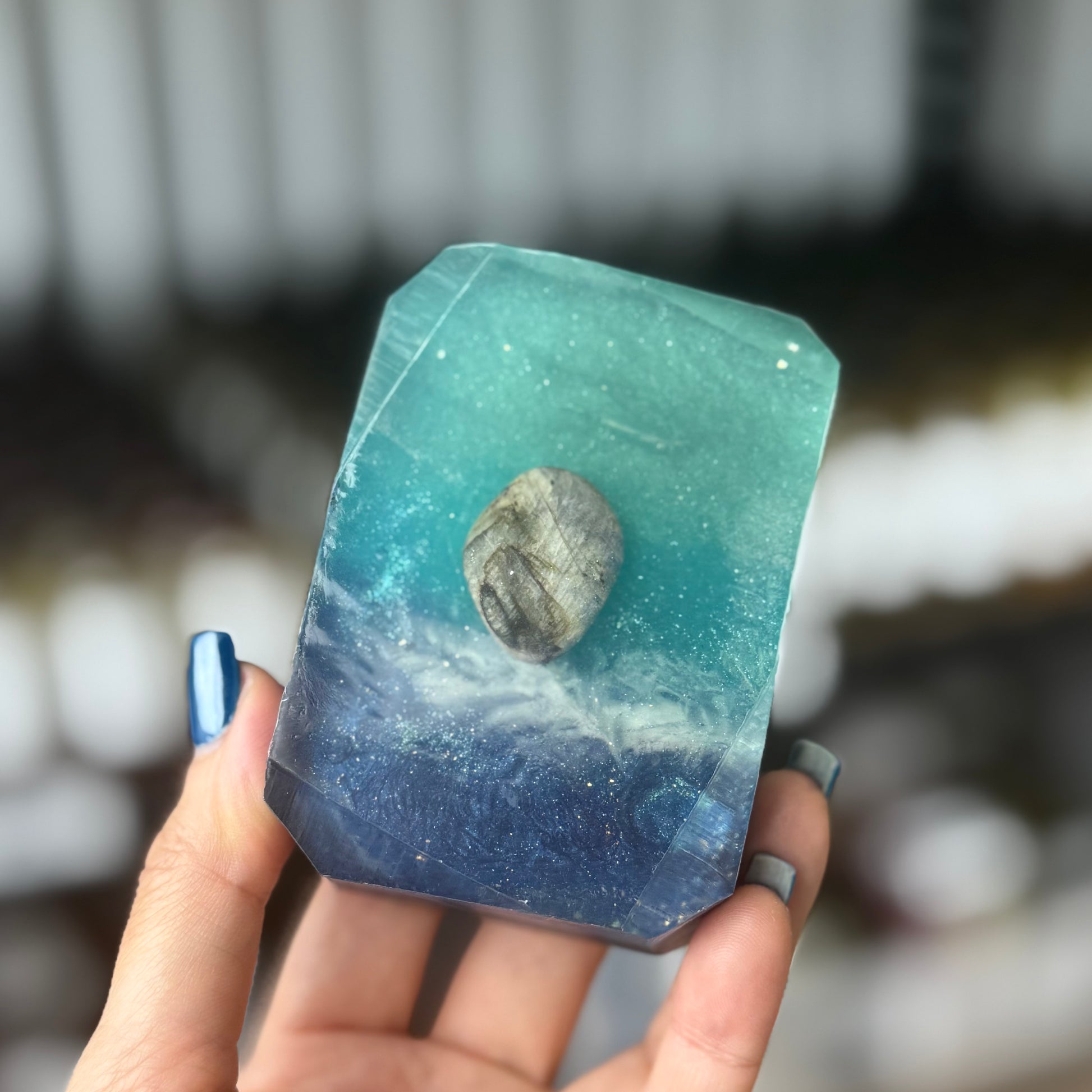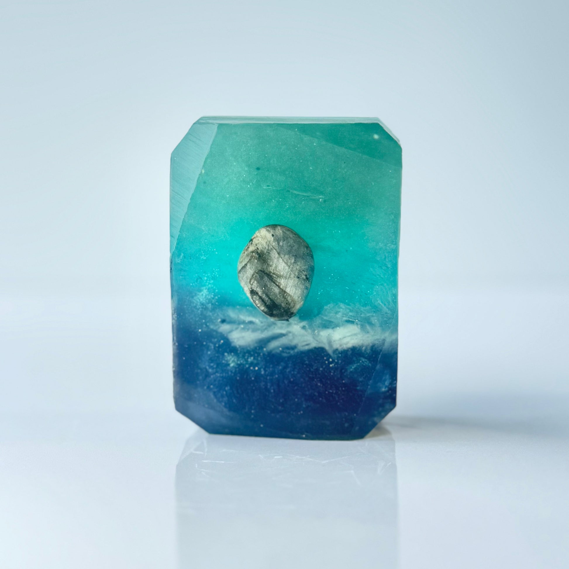 Embedded with Labradorite this bar awakens intuition, strengthens trust in inner guidance, and shields against negativity. As a stone of transformation, it encourages self-discovery and sparks the magic of possibility. Scented with a deep, oceanic aroma with airy ozone, crisp sea salt, warm sandalwood, and sensual musk. Balanced yet mysterious, it mirrors the pull of shadowed waters and the intrigue of the unseen.