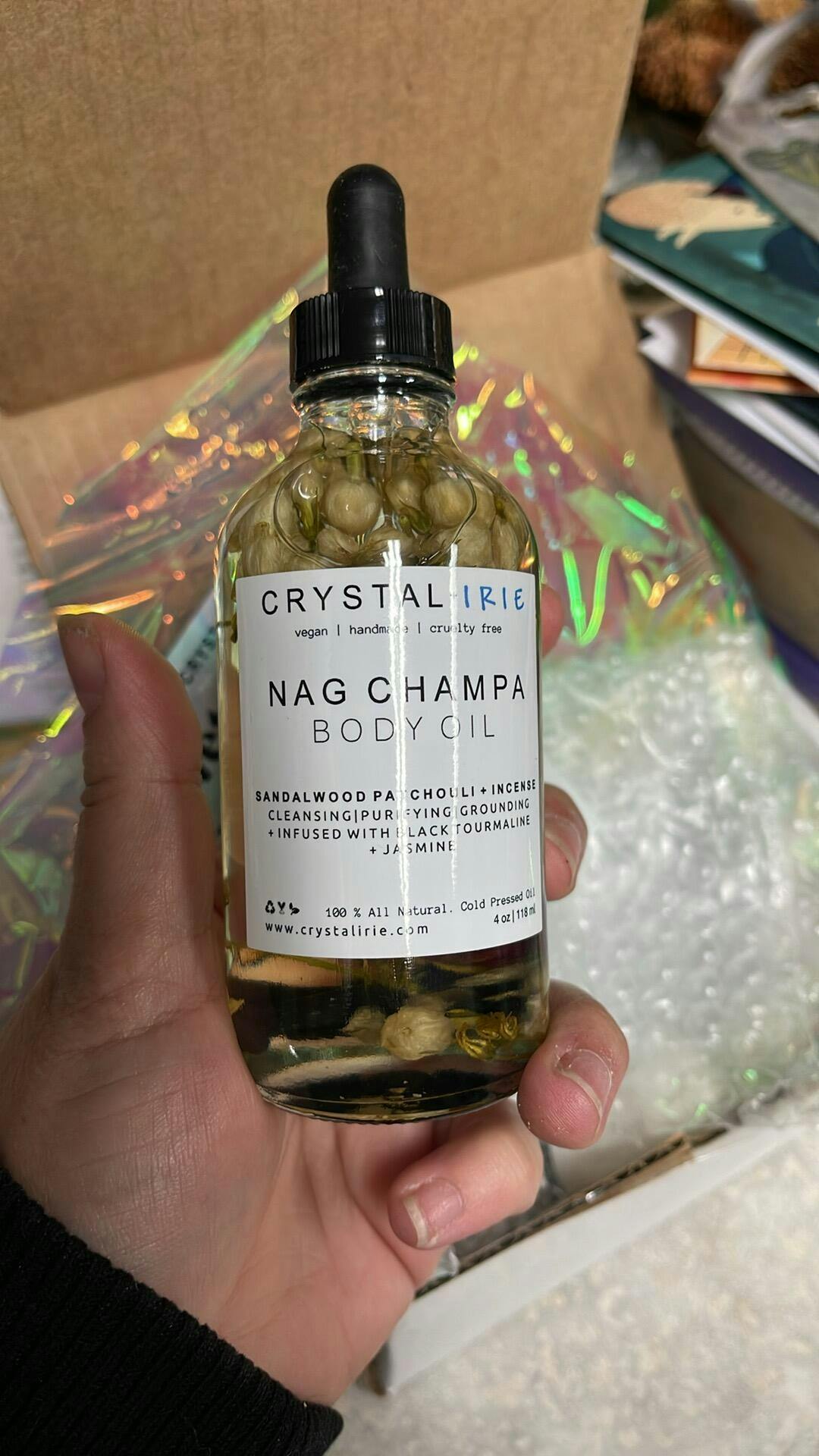 Nag Champa Oil is a lightweight full body oil is Infused with Jasmine and Black Tourmaline.