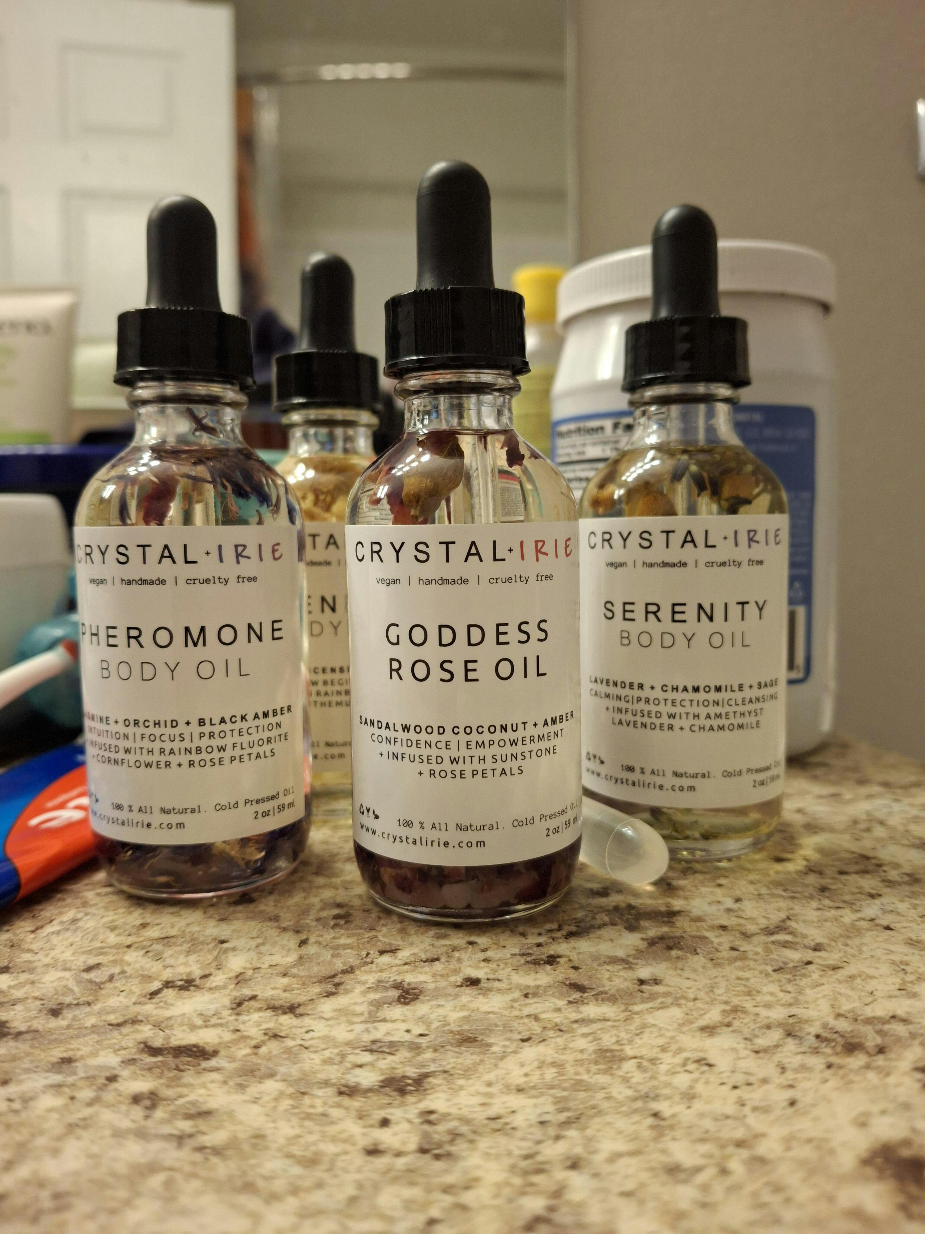 Discover the magical power of Pheromone Body Oil! Indulge in this ultimate sensory experience with this seductive blend of oils. Black Amber + Orchid + Jasmine, and musk collide to create a deeply intriguing, sexy, and sophisticated fragrance. Infused with Rainbow Fluorite crystals. Made with complex base notes of Mandarin, exotic woods, Ylang, and musk. Creates a unique and irresistible essence. Pheromone Body Oil infused with the energy of Rainbow Fluorite as It intensifies focus and ignites your intuition.