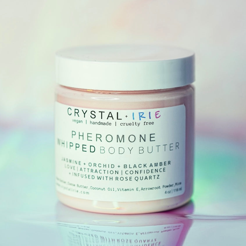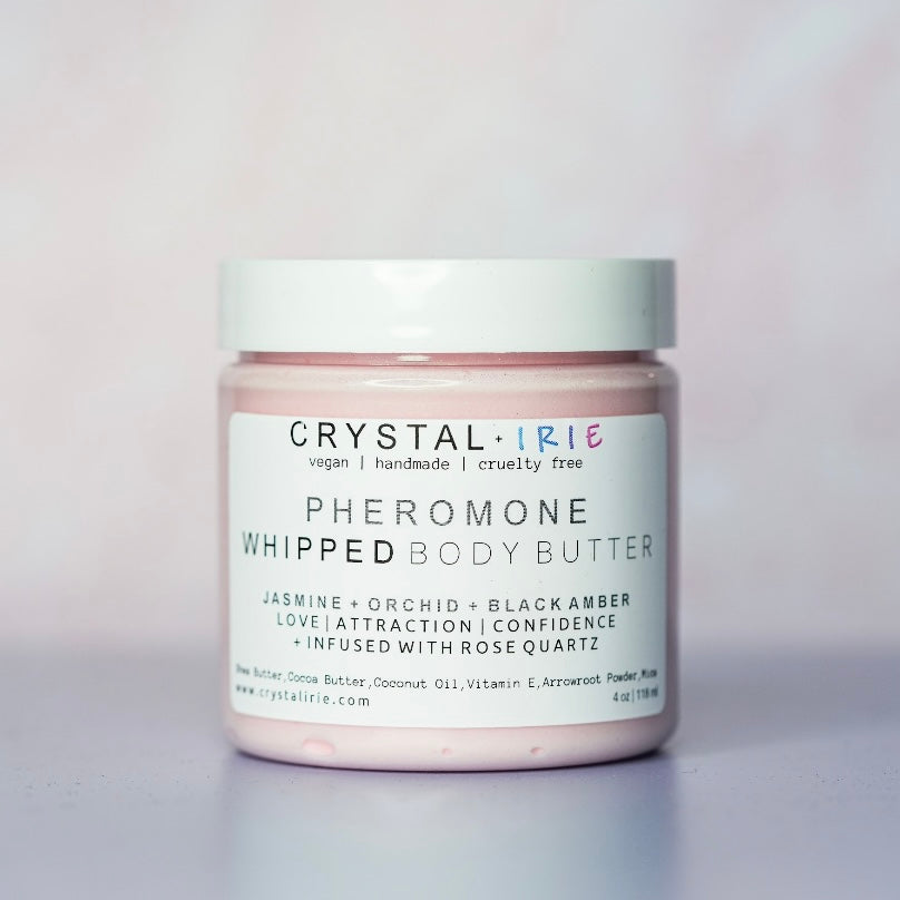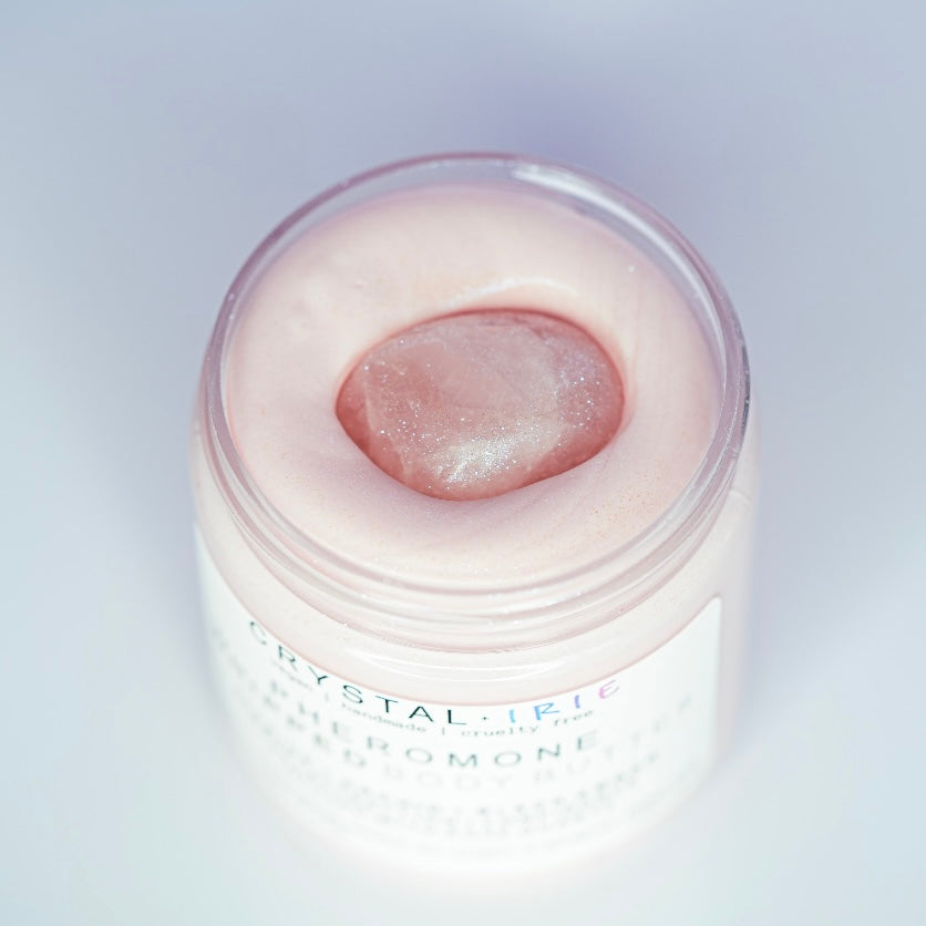 • Pheromone Body Butter (Limited Edition)-   A Rose Quartz Shimmer Body Butter that promotes love, attraction and self confidence. Whipped with Shea Butter + Cocoa Buttercoconut oil and Arrowroot. Scented with a blend of black amber, orchid, jasmine, mandarin, exotic woods, and musk creates a deeply alluring and irresistible essence.